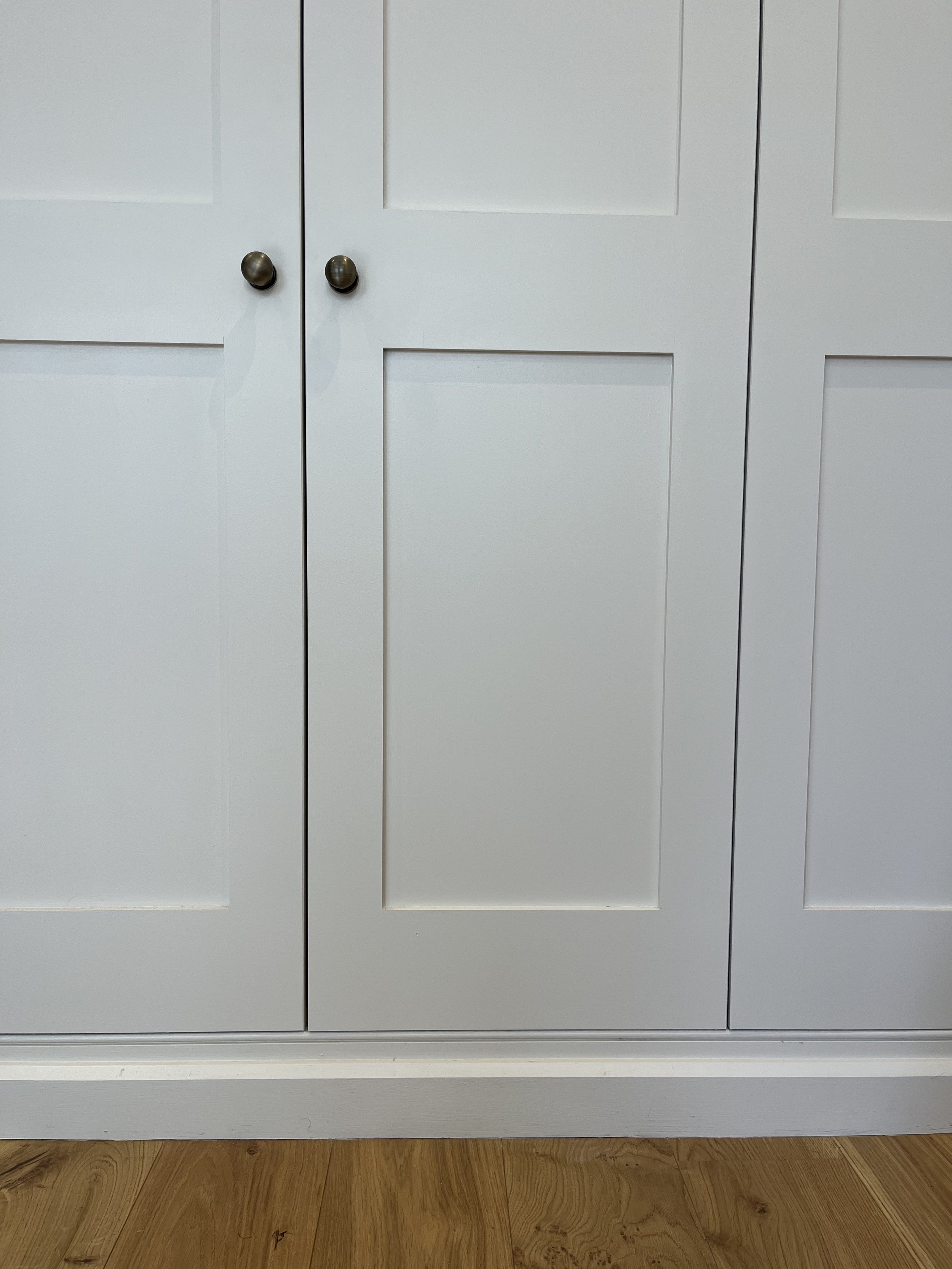 The doors on modern and contemporary handmade cabinetry often come with a shadow gap and flush doors with concealed hinges to make clean straight lines. Concealed hinges can be calibrated to perfectly align doors, and we can incorporate a micro bevel around the edge of the door, which is a popular choice. Victorian and Georgian style units have panelled doors, usually using a profile molding, to match the existing style of the room.